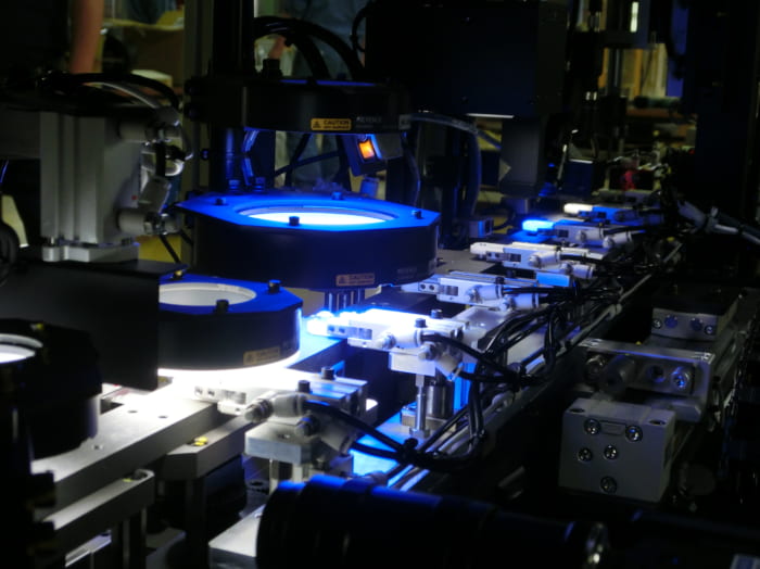 計6台の高画素カメラを使用し、部品の精密な画像検査を行う装置です。NG品は寸法系NGと打痕系NGに自動で振り分けられ、前工程の改善にも役立てられています。